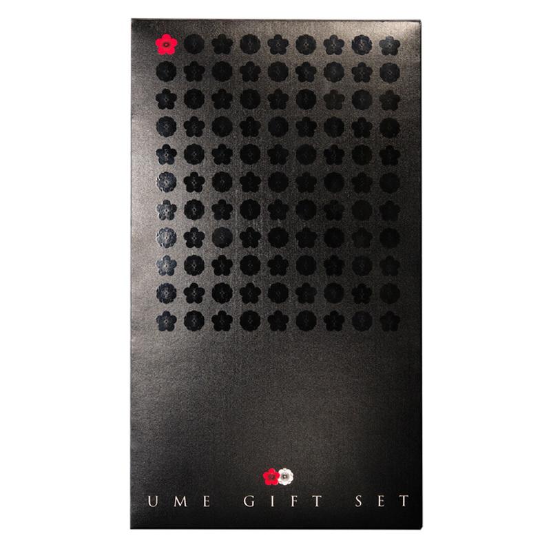 「樽仕込高級梅酒 ゆめひびき」と「梅花爛漫プレミアム」を、シックだけどちょっと可愛らしい、梅ギフト箱に詰合せました。