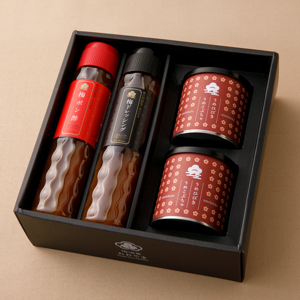 大分県日田市大山町産の安心・安全な梅だけを使った、梅ドレッシングと梅ポン酢と人気商品の梅昆布茶を2個セットにしたギフトセットです。