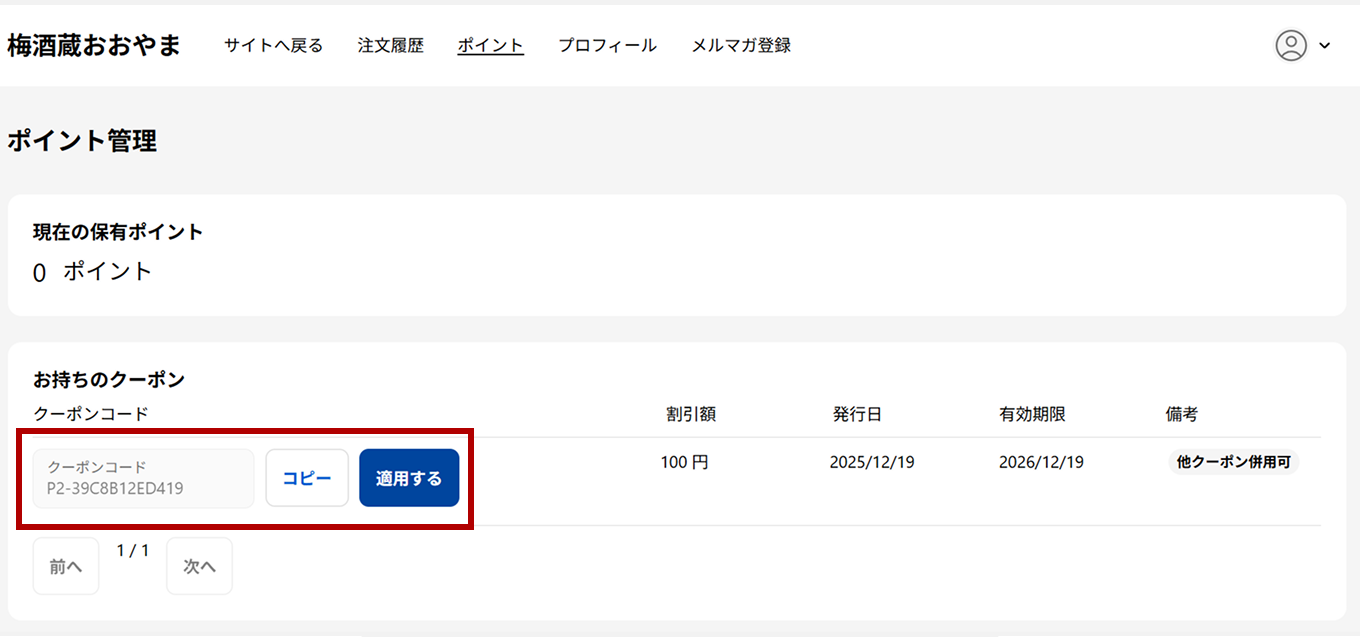 クーポンの引き換え、レビュー投稿、保有ポイントの確認については、ご自身のマイページにてご確認いただけます。